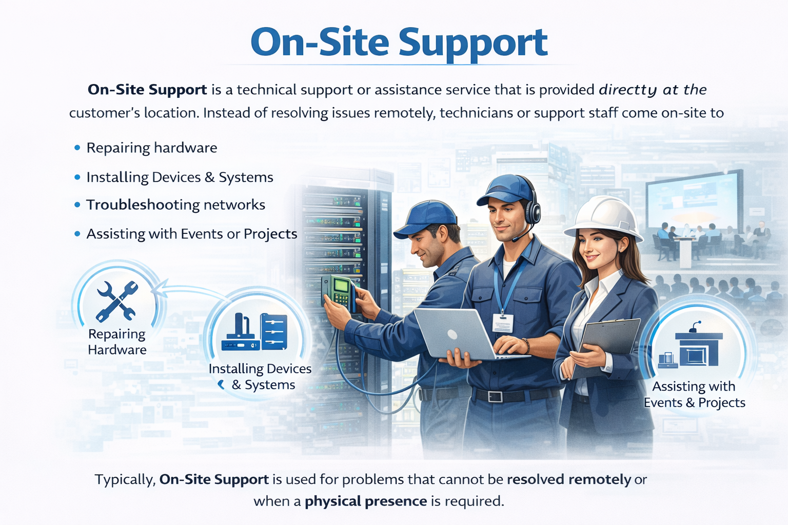 is a technical support or assistance service that is provided directly at the customer's location. Instead of resolving issues remotely, technicians or support staff come on-site to handle needs such as: